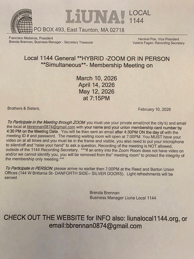 Notice – Hybrid – Zoom Meetings are held the 2nd Tuesday at 7:15pm of each Month unless stated otherwise. THIS SITE IS FOR THE MEMEBERS WHO ARE EMPLOYEED BY THE CITY OF TAUNTON AND ATTLEBORO OR THE NRWD who are looking for information regarding their UNION.